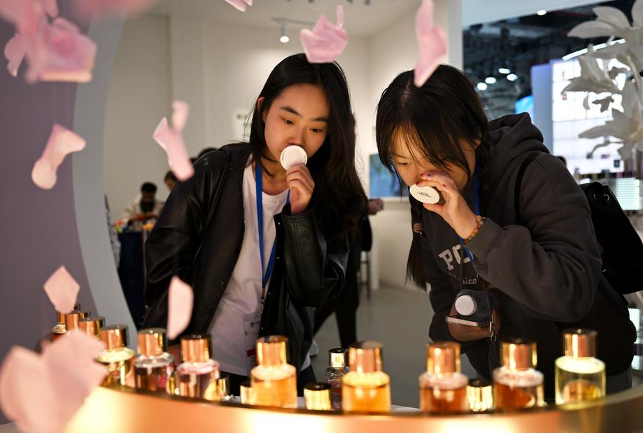 관람객이 9일 제7회 CIIE 로레알 전시부스에서 향수를 시향하고 있다. (사진/신화통신)