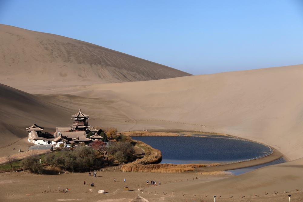 [신화망 둔황 11월12일] 초겨울이 성큼 다가온 간쑤(甘肅)성 둔황(敦煌)시의 밍사산(鳴沙山) 웨야취안(月牙泉) 관광지가 그림 같은 풍경을 자아내고 있다.