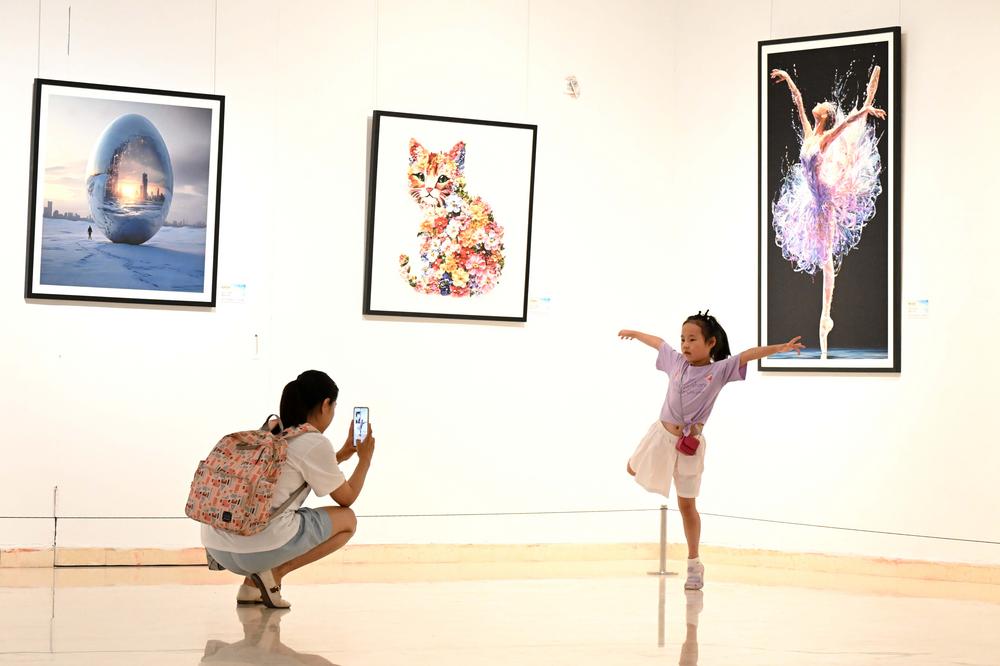 14일 허베이(河北)성 스좌좡(石家莊)시 미술관에 전시된 인공지능(AI) 아트화 작품 앞에서 기념사진을 찍는 어린이.