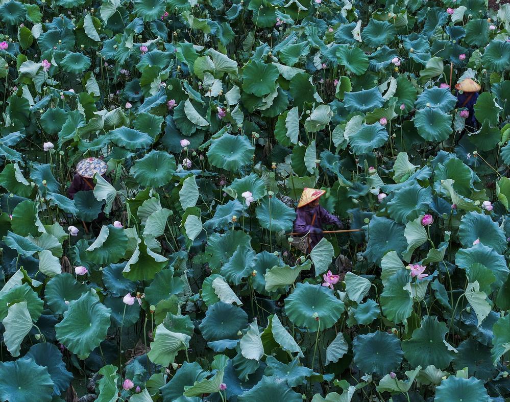 18일 새벽(현지시간) 연못에서 연방을 수확 중인 연밥 재배 농가. 2025.7.18