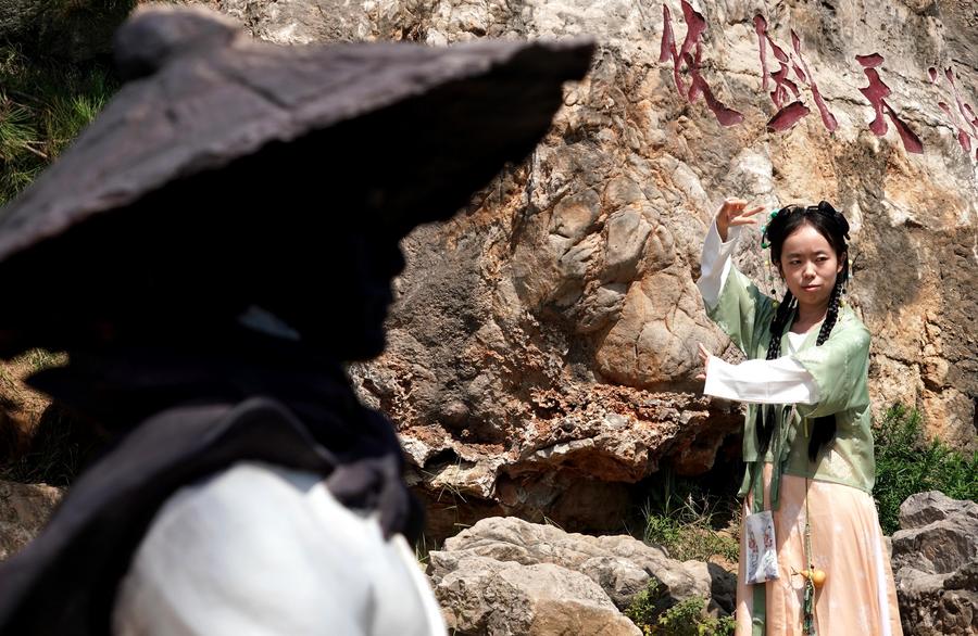 지난해 9월 16일 허난(河南)성 카이펑(開封)에 위치한 완쑤이산(萬歲山)무협성을 방문한 관광객이 전통의상을 입고 인증샷을 찍고 있다. (사진/신화통신)
