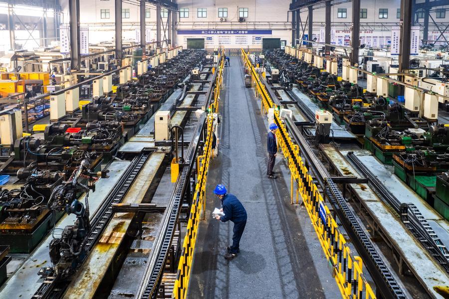 지난 11일 후난(湖南)성 타오위안(桃源)현에 위치한 후난 페이워(飛沃)신에너지테크회사 작업장에서 풍력발전기 블레이드 고정 부품 제작에 한창인 근로자를 드론에 담았다. (사진/신화통신)