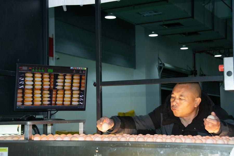 지난 11월 28일 후난(湖南)성 융저우(永州)시 렁수이탄(冷水灘)구의 한 달걀 분류 센터 직원이 달걀을 점검하고 있다. (사진/신화통신)