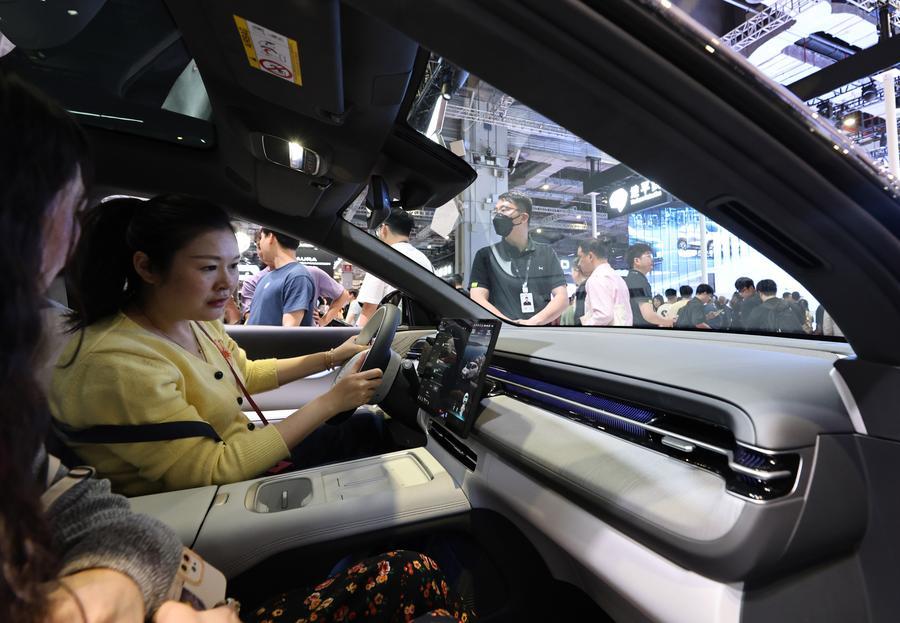 2025년 4월 26일 '제21회 상하이 국제자동차산업전시회(상하이모터쇼)'에서 샤오펑(小鵬·Xpeng) G6 전시 차량의 스마트 시스템을 체험하는 방문객. (사진/신화통신)