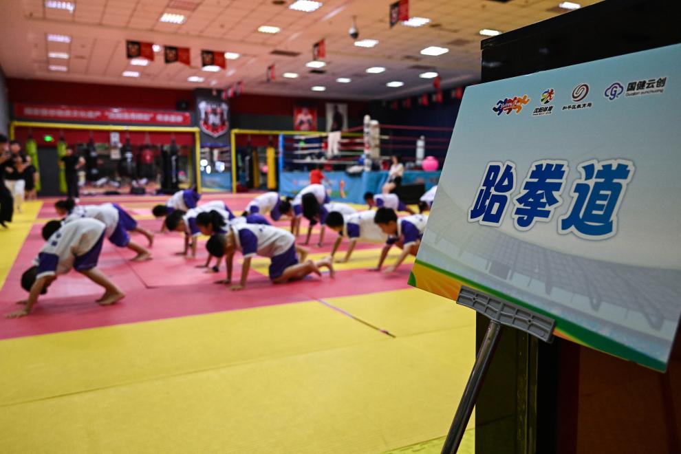 7月15日,學生們在活動前進行熱身訓練。新華社發(賈軼程攝)