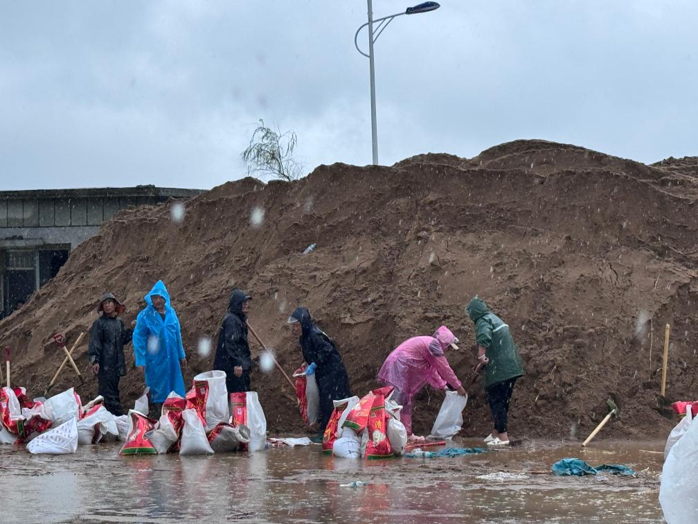 當地黨員幹部、群眾在烏牛堡子村村委會門口裝沙袋。(受訪者供圖)