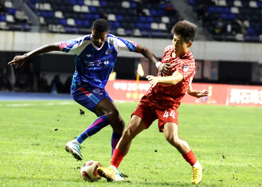 2024年9月22日,遼寧鐵人隊球員陳永澤(右)與石家莊功夫隊球員阿約維在2024賽季中國足球協會甲級聯賽第24輪比賽中拼搶。新華社發(張曉峰 攝)