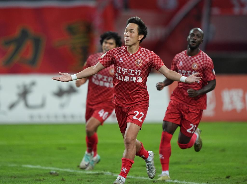 2024年9月1日,遼寧鐵人隊球員邦本宜裕在2024賽季中國足球協會甲級聯賽第21輪比賽中慶祝進球。新華社記者 李鋼 攝