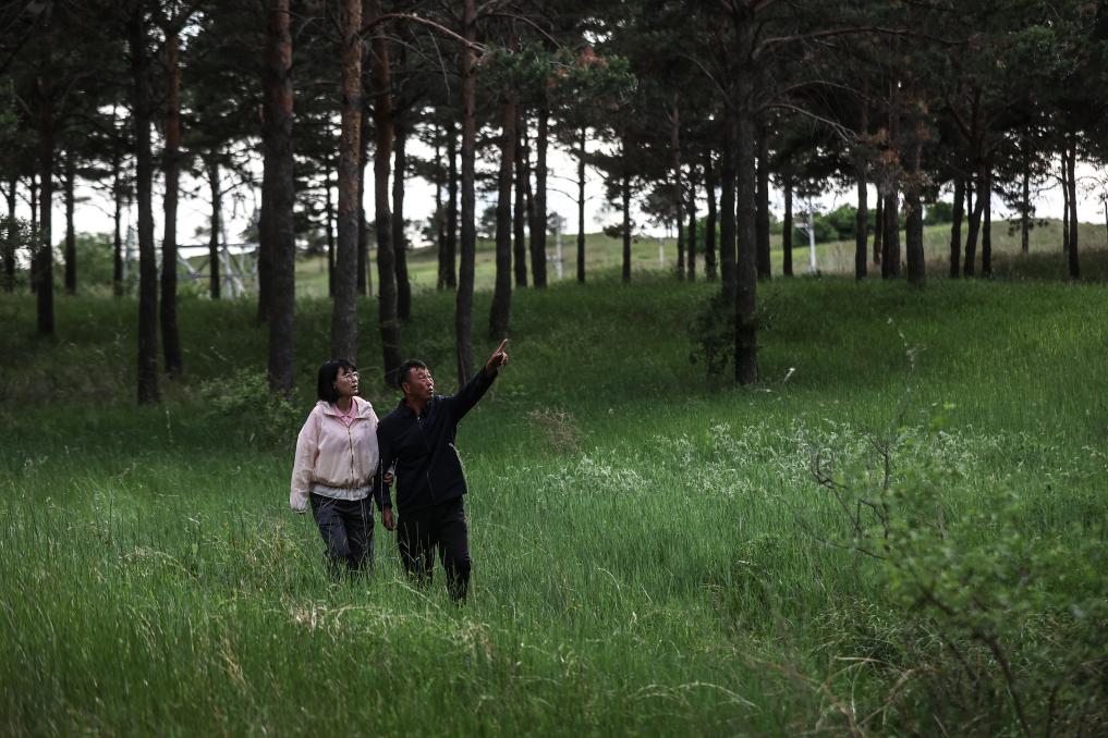 6月3日,李明明下班後來到林場,與父親李東魁一起在林間散步。新華社記者潘昱龍攝