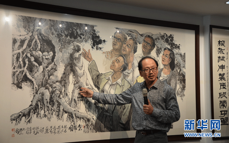 馬來西亞華裔畫家陳龍秋講解《扎根圖》創作過程。