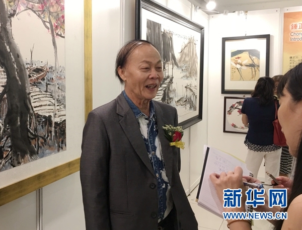鐘正川在畫展現場接受媒體訪問。新華網發 王大瑋攝