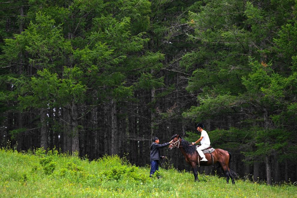 7月5日,游客在內蒙古阿爾山國家森林公園體驗騎馬。