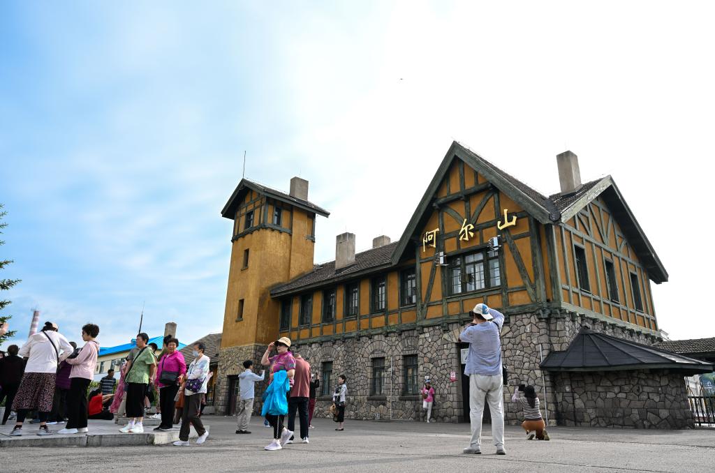 7月4日,游客在內蒙古興安盟阿爾山市火車站游玩。