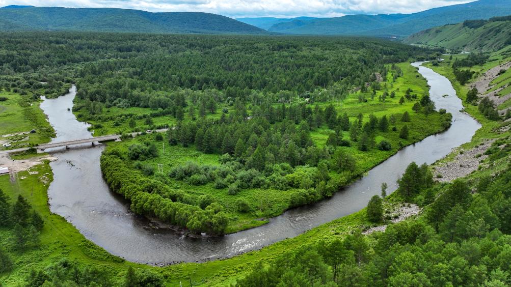 7月5日拍攝的流經內蒙古阿爾山國家森林公園的哈拉哈河(無人機照片)。