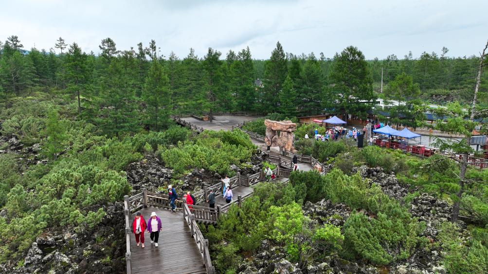 7月5日,游客在內蒙古阿爾山國家森林公園石塘林景區游玩(無人機照片)。