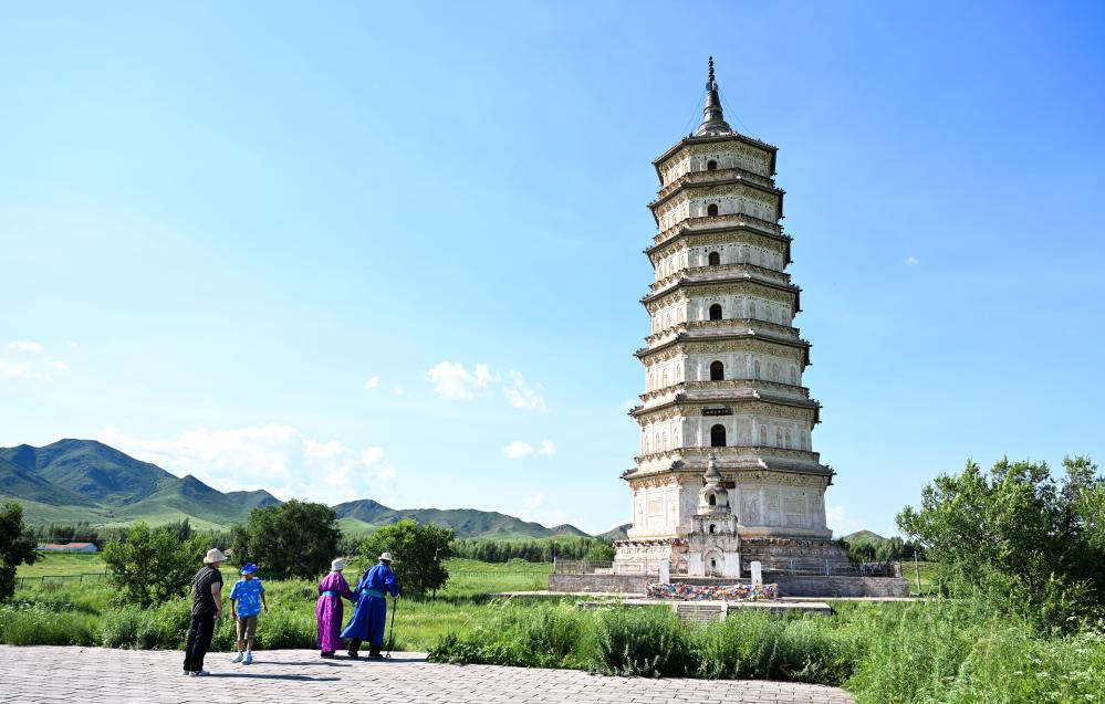 7月21日,游客在內蒙古赤峰市巴林右旗遼慶州白塔游覽參觀。