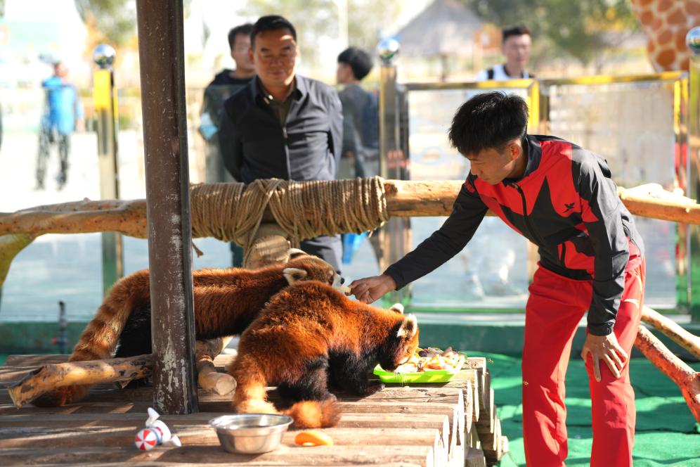 10月13日,何傑(右)在沙湖景區內游覽並與小熊貓互動。新華社發(趙志陽 攝)