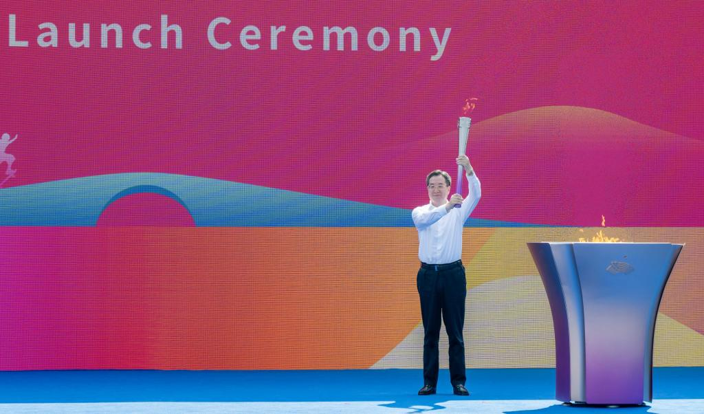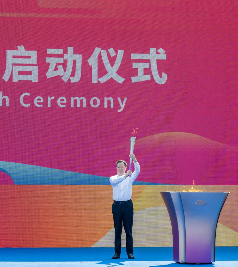 O vice-primeiro-ministro chinês Ding Xuexiang, também membro do Comitê Permanente do Birô Político do Comitê Central do Partido Comunista da China, acendeu a tocha em um caldeirão em uma cerimônia realizada na Praça do Parque Yongjin, onde anunciou o início do revezamento.