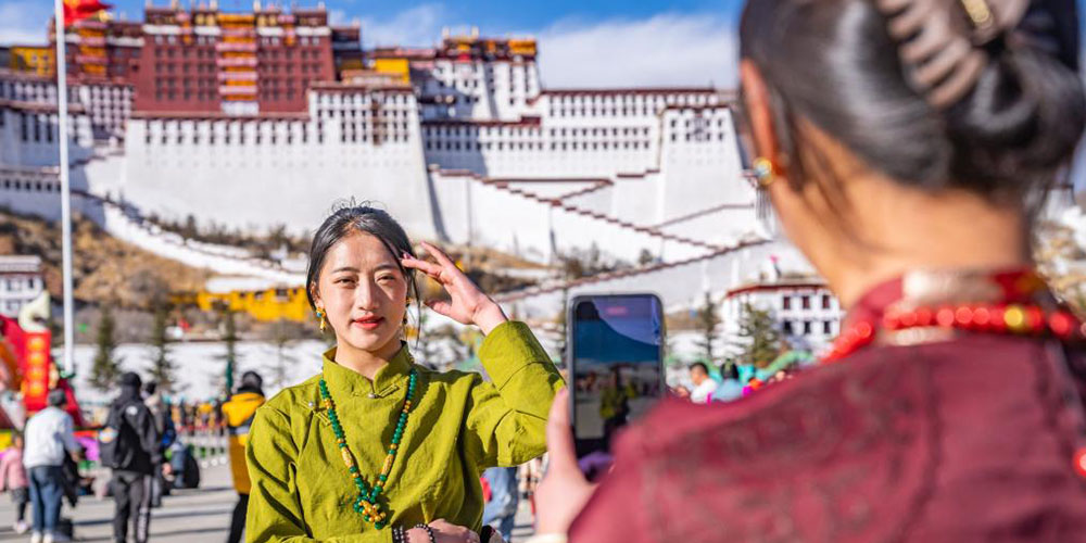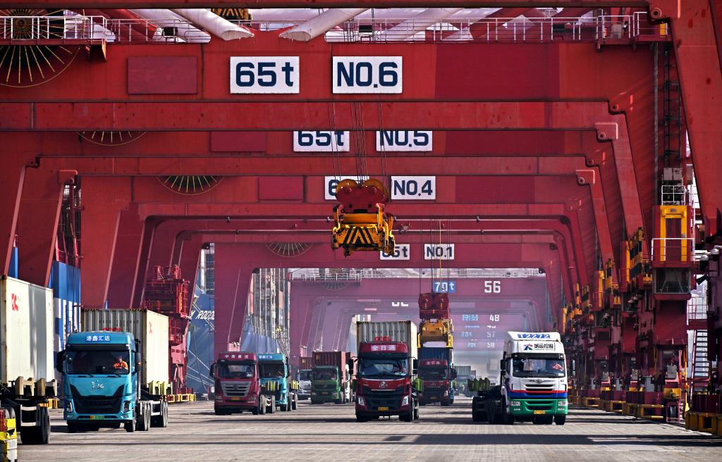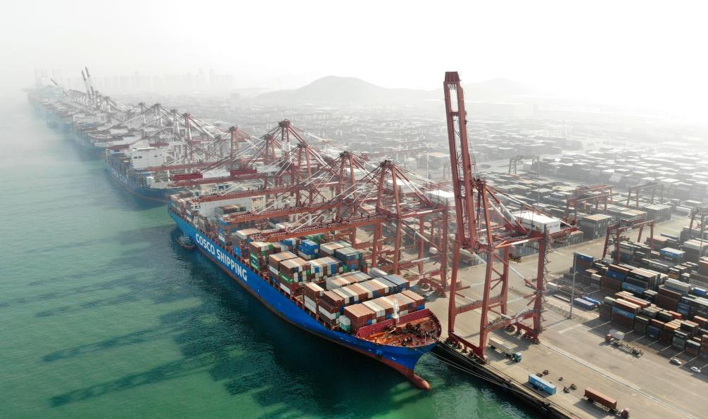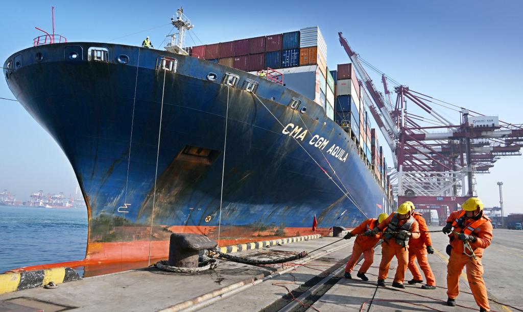(240211) -- QINGDAO, Feb. 11, 2024 (Xinhua) -- An aerial drone photo shows a cargo ship docking at Qingdao Port, east China's Shandong Province, Feb. 11, 2024. The Qingdao port is busy handling goods for export during the Spring Festival holiday. (Xinhua/Li Ziheng)