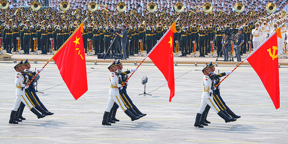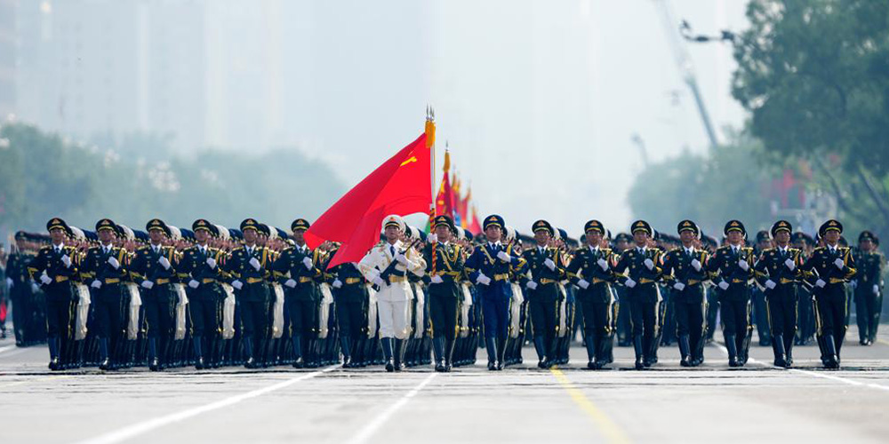 Formação de guardas de honra do ELP marcha pela Praça Tian'anmen