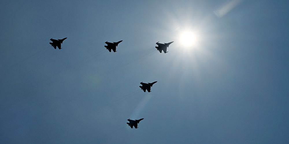 Caças embarcados sobrevoam a Praça Tian'anmen em desfile