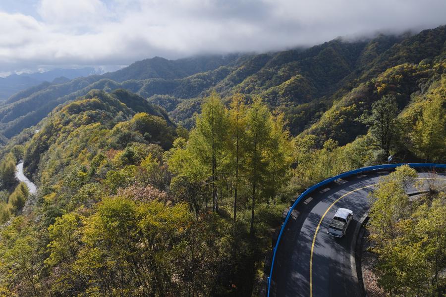 Foto aérea de drone tirada em 30 de outubro de 2025 mostra uma vista da Montanha Hualong no distrito de Zhenping, na cidade de Ankang, Província de Shaanxi, no noroeste da China. (Xinhua/Shao Rui)