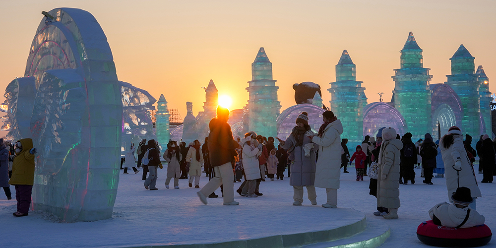 Turistas se divertem ao pôr do sol no Mundo de Gelo e Neve de Harbin, no nordeste da China