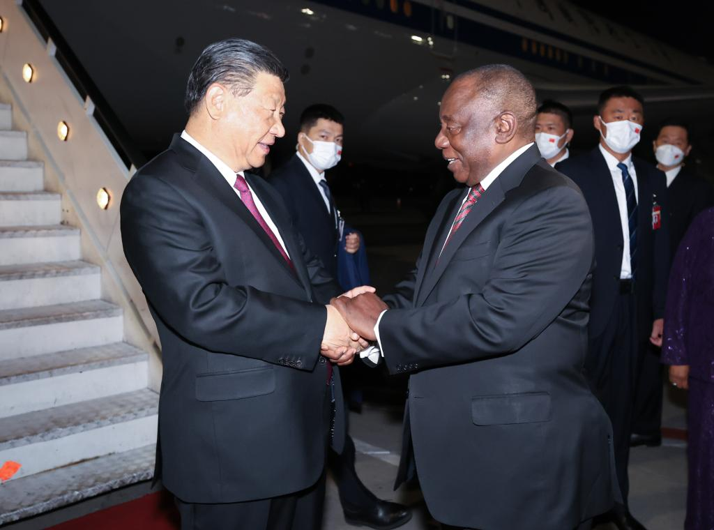 O presidente sul-africano, Cyril Ramaphosa, juntamente com a ministra de Relações e Cooperação Internacionais da África do Sul, Naledi Pandor, e Nkosazana Clarice Dlamini-Zuma, ministra da Presidência responsável por Mulheres, Jovens e Pessoas com Deficiência, saudaram calorosamente Xi no Aeroporto Internacional OR Tambo, de Joanesburgo.