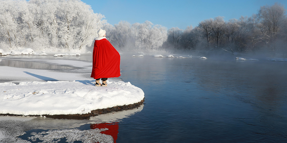 Paisagem deslumbrante atrai visitantes ao ponto turístico temático de sincelo no Distrito de Xunke, na Província de Heilongjiang