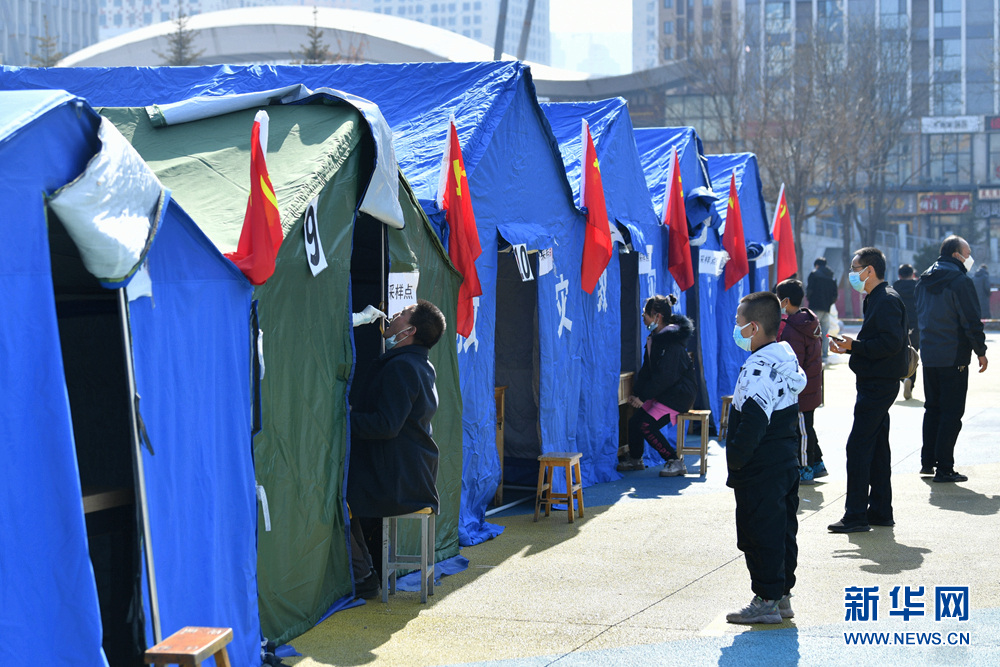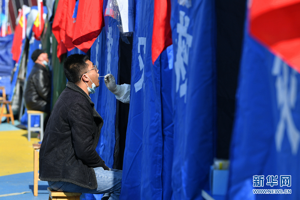 11月10日,市民在西寧市城西區北城7區廣場臨時核酸檢測點做採樣。新華網 卡婭梅朵 攝