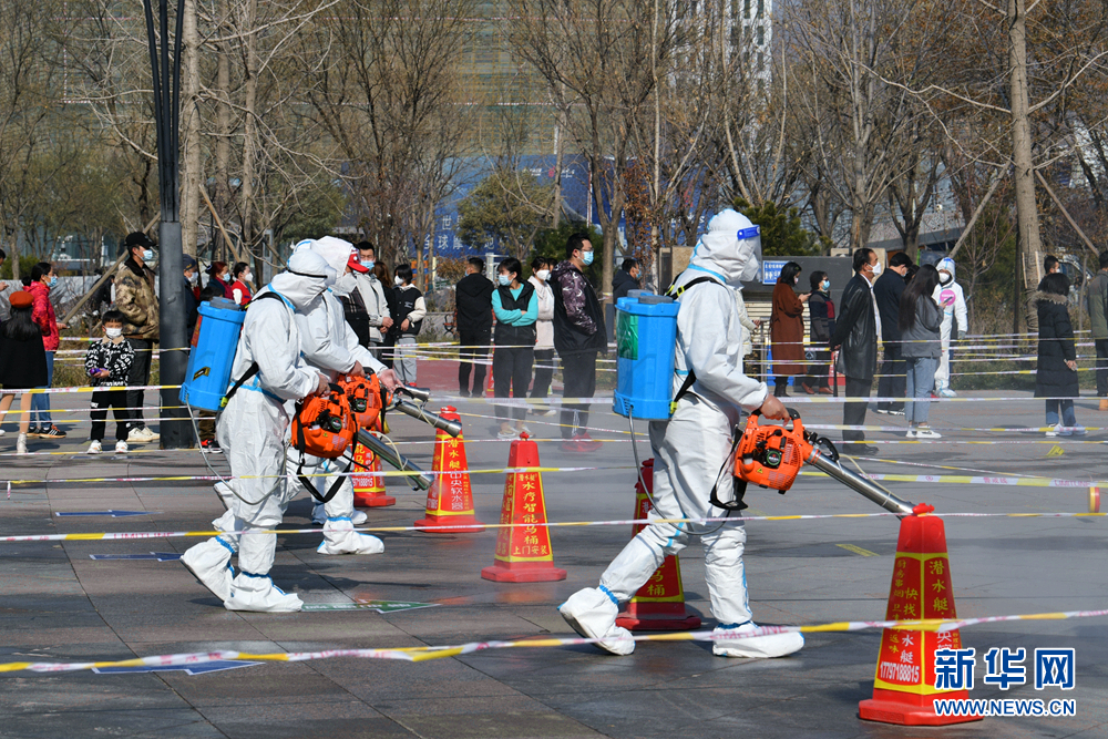 11月10日,工作人員在西寧市城西區北城7區廣場臨時核酸檢測點進行現場消殺。新華網 卡婭梅朵 攝