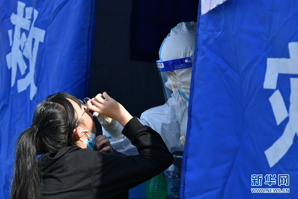 11月10日,一位市民在西寧市城西區夏都景苑北門臨時核酸檢測點做採樣。新華網發(陳錫明 攝)