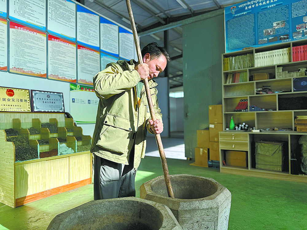 鬧丁多傑正在錘磨香料。 記者 張子涵 攝