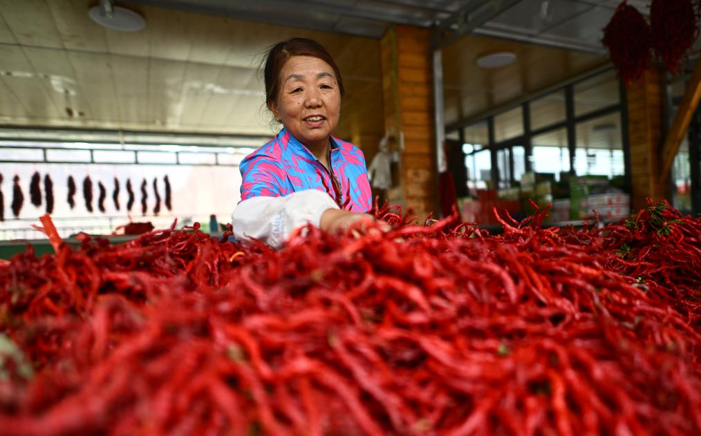 9月11日,在青海省海東市循化撒拉族自治縣清水鄉下灘村,村民整理線辣椒準備晾曬。