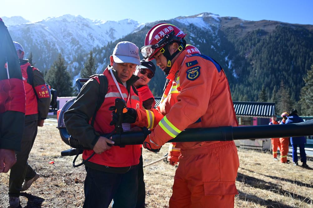 11月8日,在青海省海北藏族自治州祁連縣阿咪東索林區,祁連縣消防救援大隊消防員(右一)指導當地護林員使用森林草原滅火救援裝備。