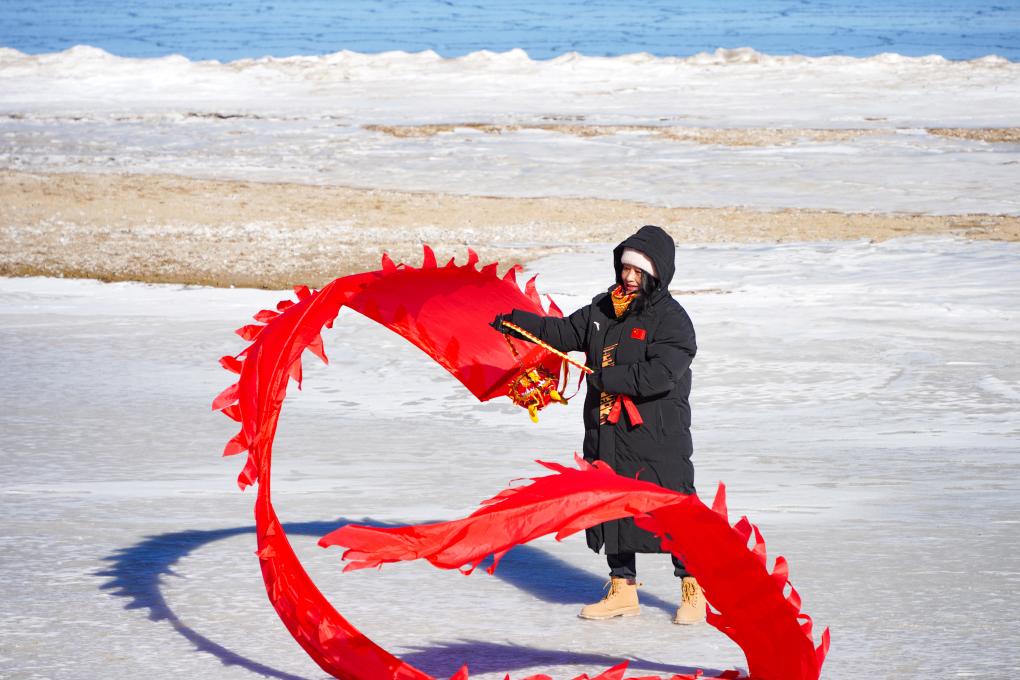 12月27日,一名徒步愛好者在活動中舞動彩帶龍。新華社記者 齊芷玥 攝