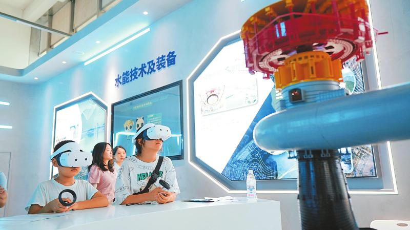 2023世界清潔能源裝備大會裝備展現場,小朋友通過MR設備感受水輪發電機組的內部結構和工作原理。記者 韋維 攝