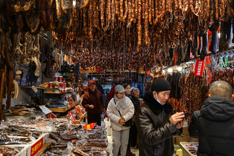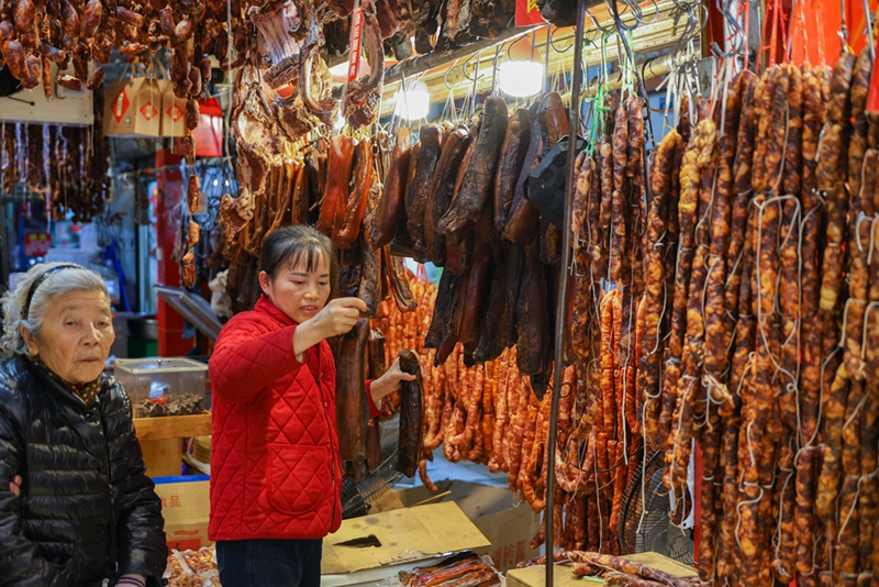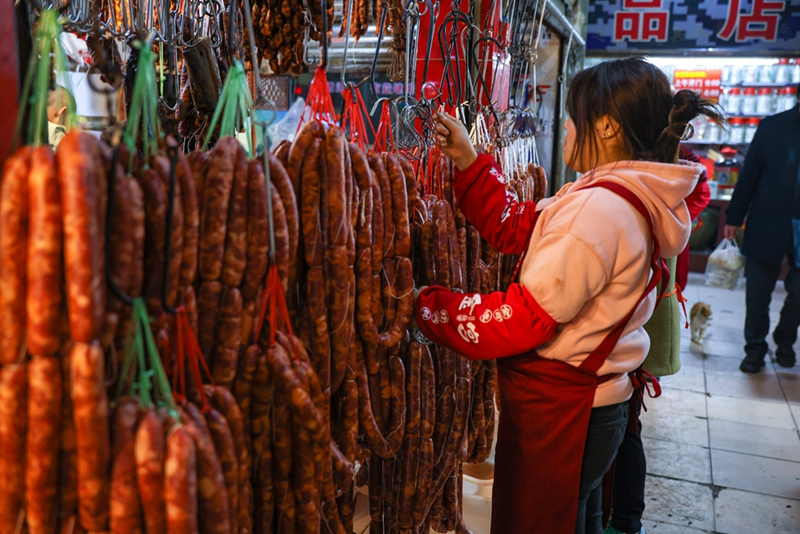 市民們來到“香腸臘肉一條街”選購臘味食品。新華網發(曹鵬 攝)