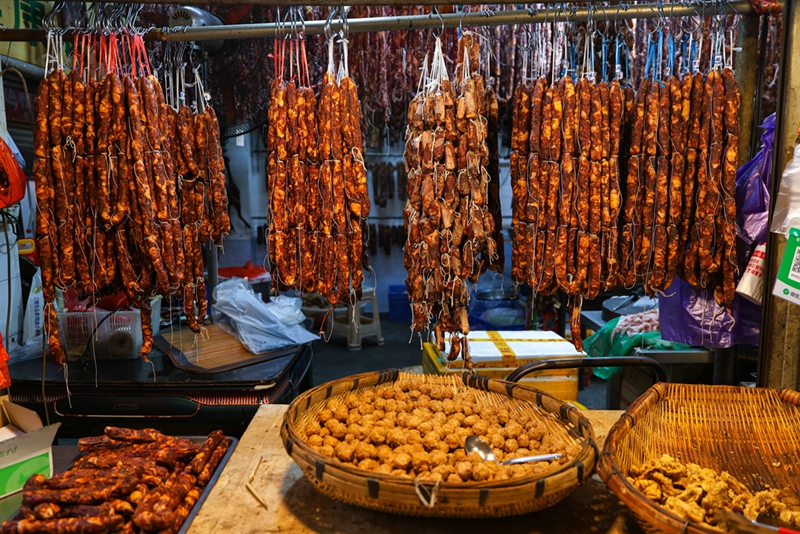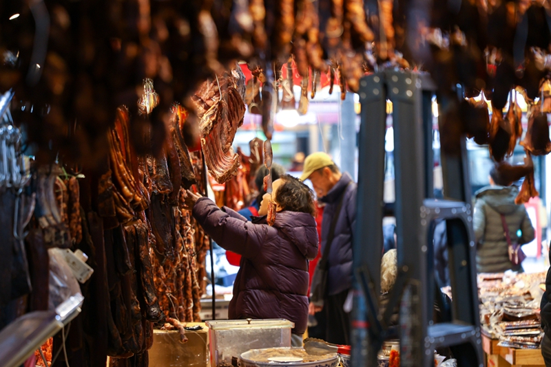 臘肉與香腸是四川人舌尖上獨特的年味記憶。走進成都人熟知的“香腸臘肉一條街”——新開寺街,濃郁的臘味撲鼻而來,仿佛一腳邁進了年的門檻。