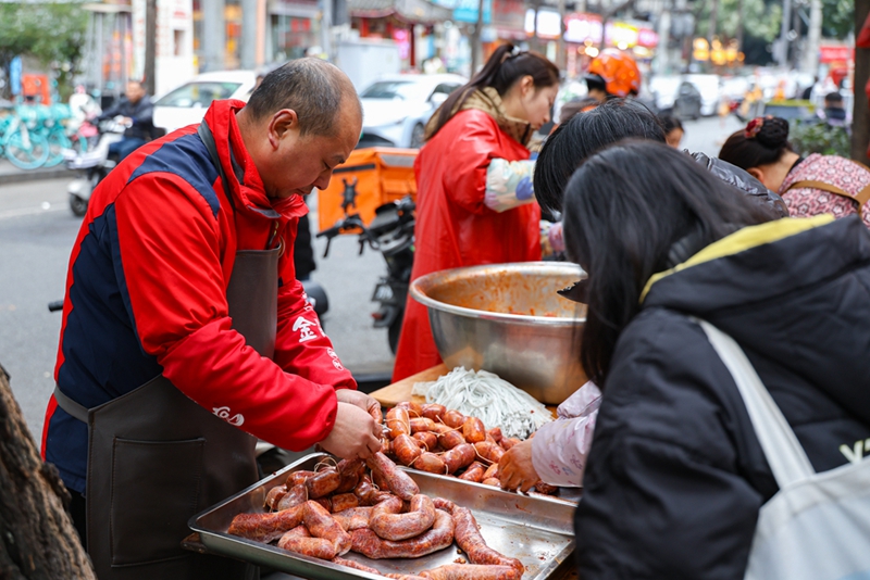 攤主們手起刀落、拌料灌腸、麻繩穿挂,忙碌中透着溫暖的煙火氣。煙熏味、五香味、麻辣味在空氣中交織,引得人頻頻回頭。