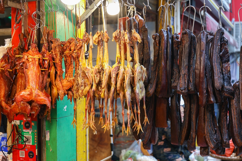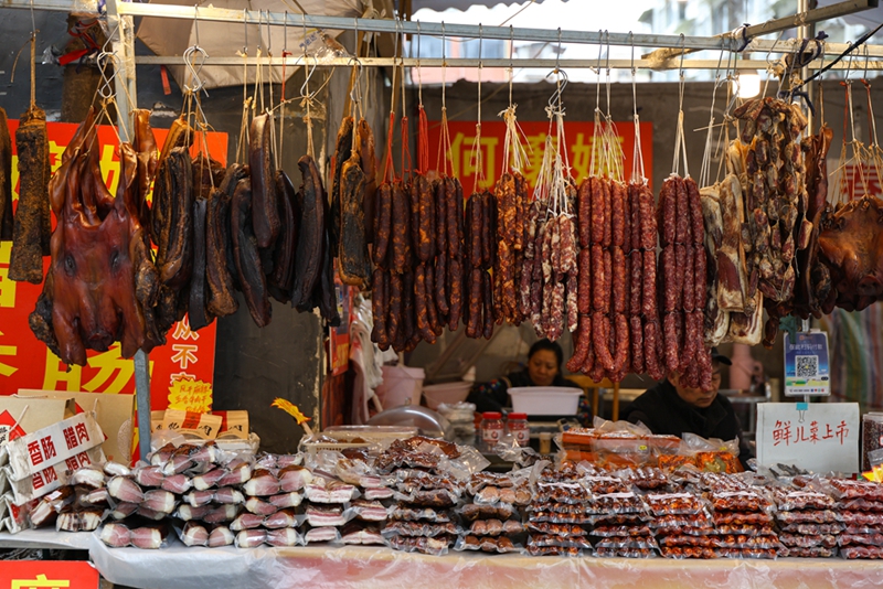 “香腸臘肉一條街”的攤位前,懸挂着臘肉、風乾雞等臘味食品。新華網發(曹鵬 攝)
