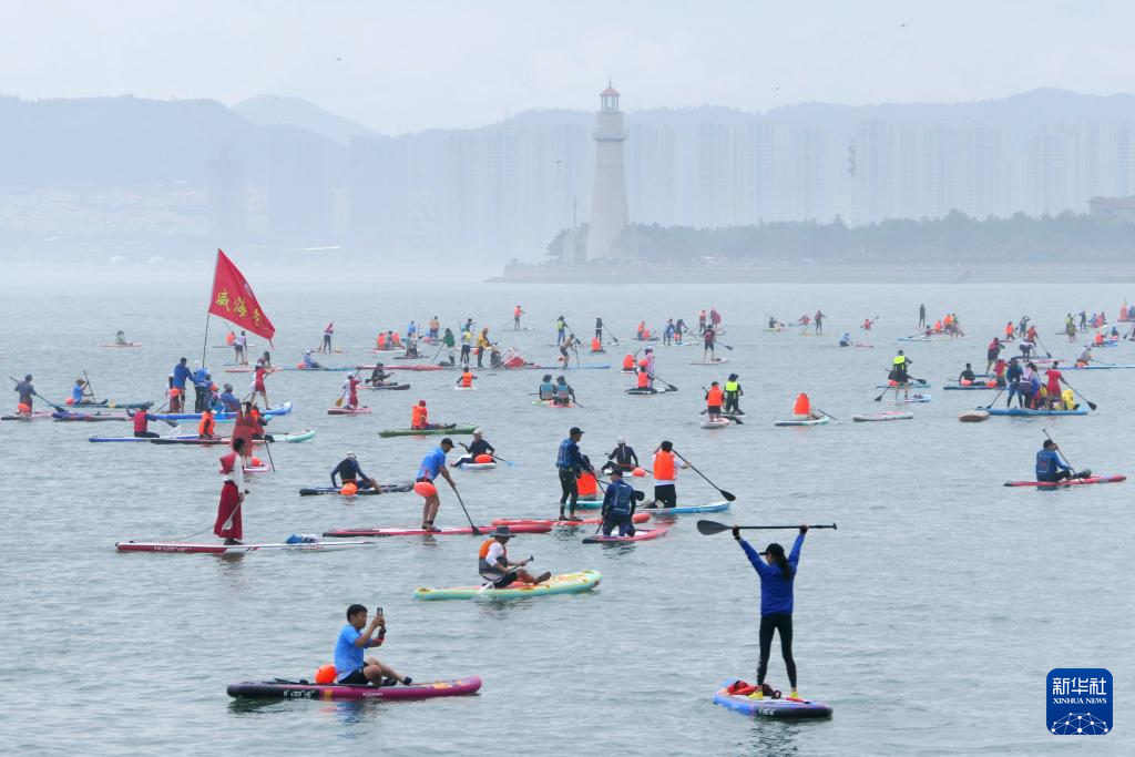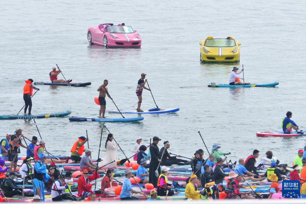 6月15日,水上運動愛好者在山東省威海市威海灣海域參加槳板巡游活動。