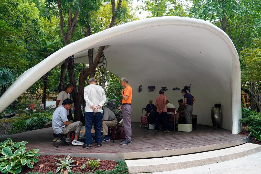 8月31日,市民在上海市徐匯區衡山花園下棋休閒。
