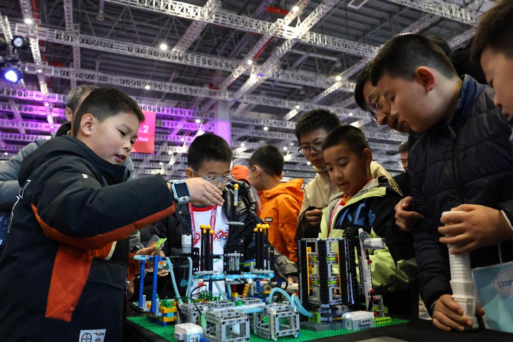 1月2日,一名小選手(左一)向參觀者介紹他的創意編程作品。