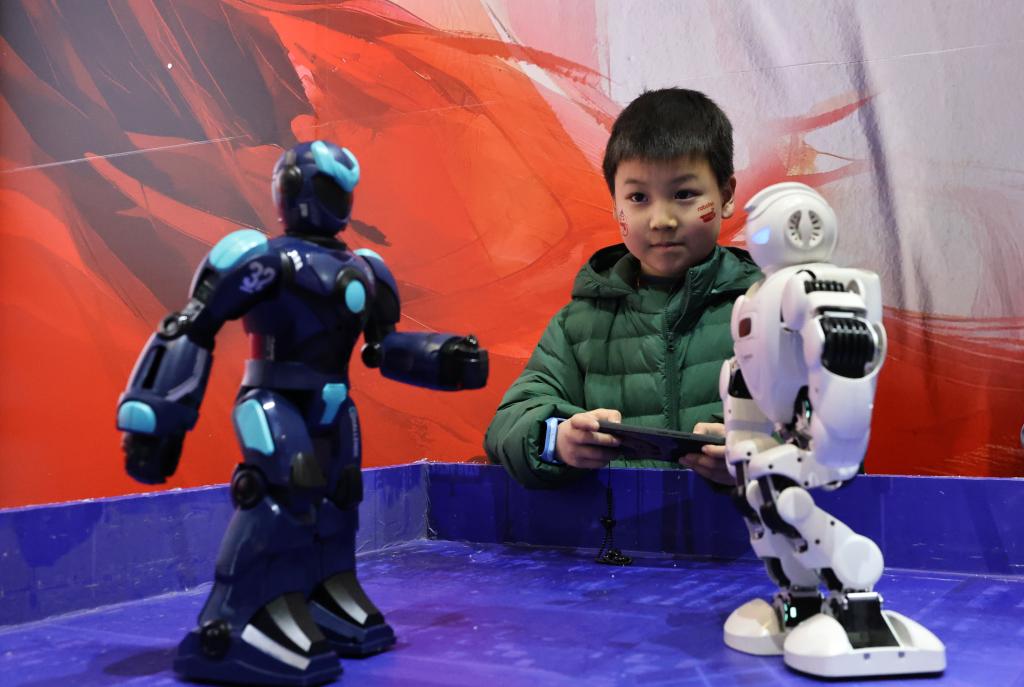 1月2日,參觀者在體驗操縱機器人進行格鬥游戲。