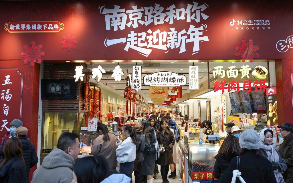 1月3日,市民游客在上海南京東路步行街上一家傳統食品銷售商店內選購。