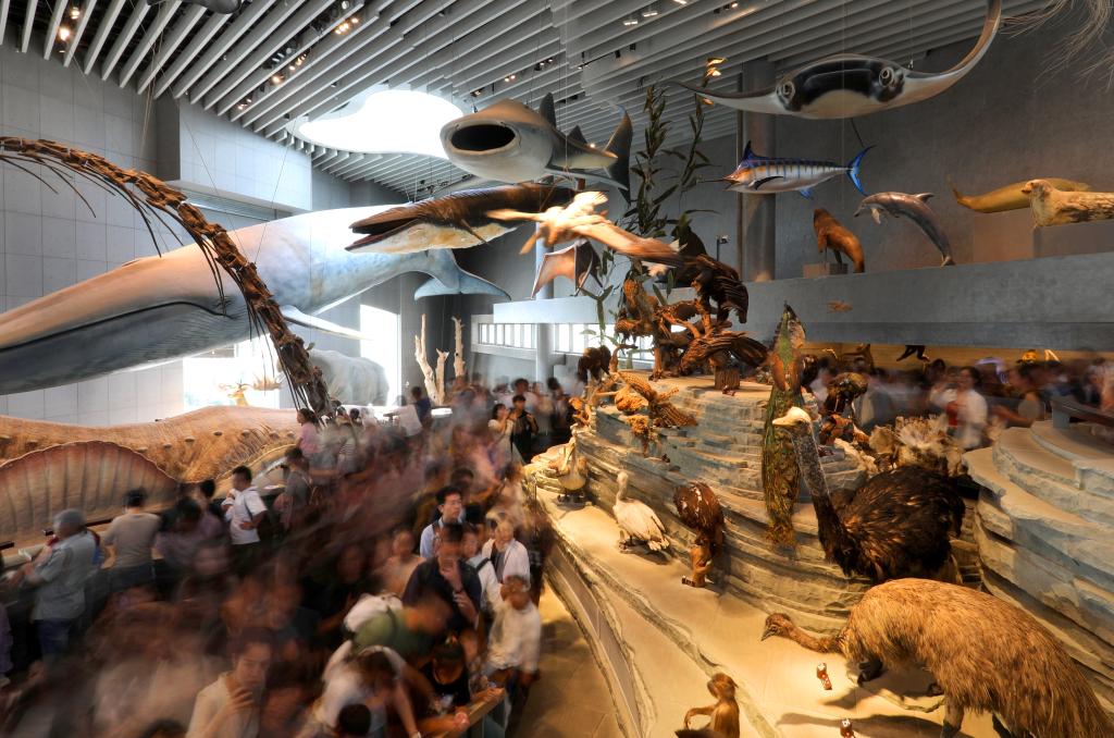 10月2日,參觀者走在上海自然博物館的生命長河展區內。