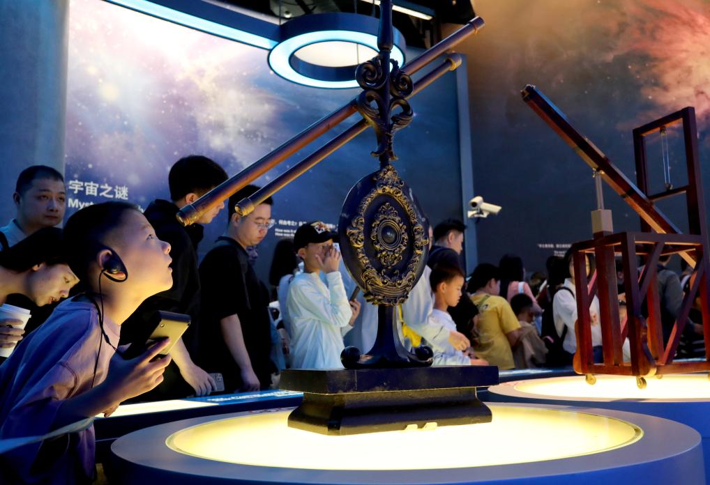 10月2日,在上海自然博物館,小朋友在伽利略望遠鏡模型前駐足觀看。