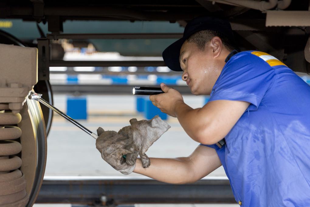 7月16日,上海機輛段客車檢車員對車輛制動裝置進行檢查。新華社記者 王翔 攝