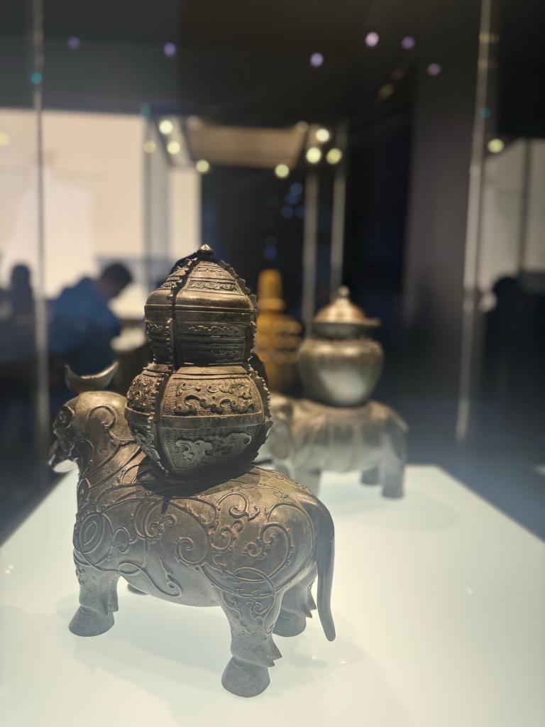 記者看到,整個展覽序廳被設計成北宋時期大晟鐘的形狀,展廳中回蕩着優雅空靈的鐘聲,展品包括了河北博物院藏北宋銅牛鼎、柏林民族學博物館藏明宣德銅鎏金孔雀明王像、大都會藝術博物館藏清代鎏金倣古銅“姑洗”鐘、故宮博物院藏清代銅犧尊等。